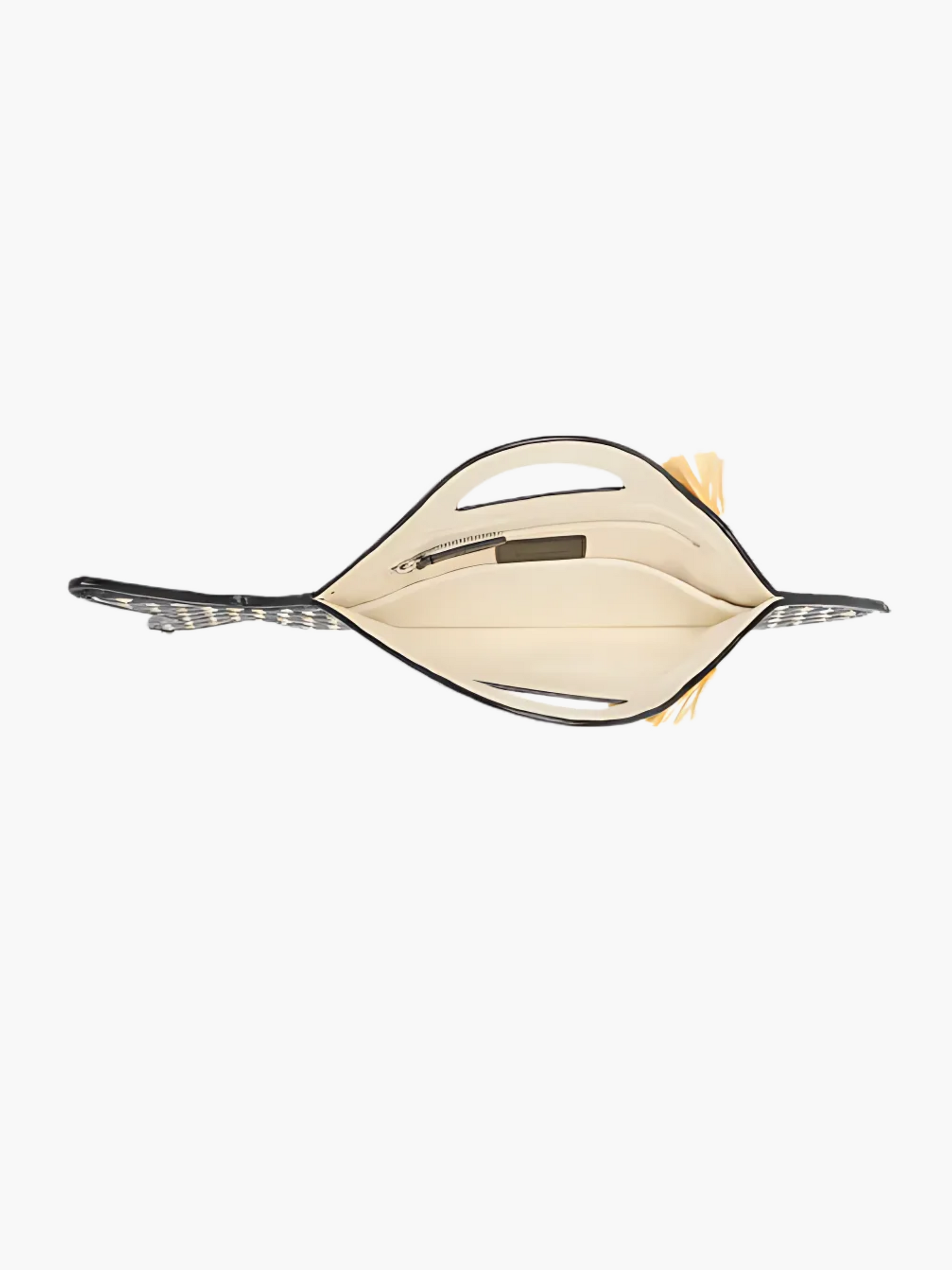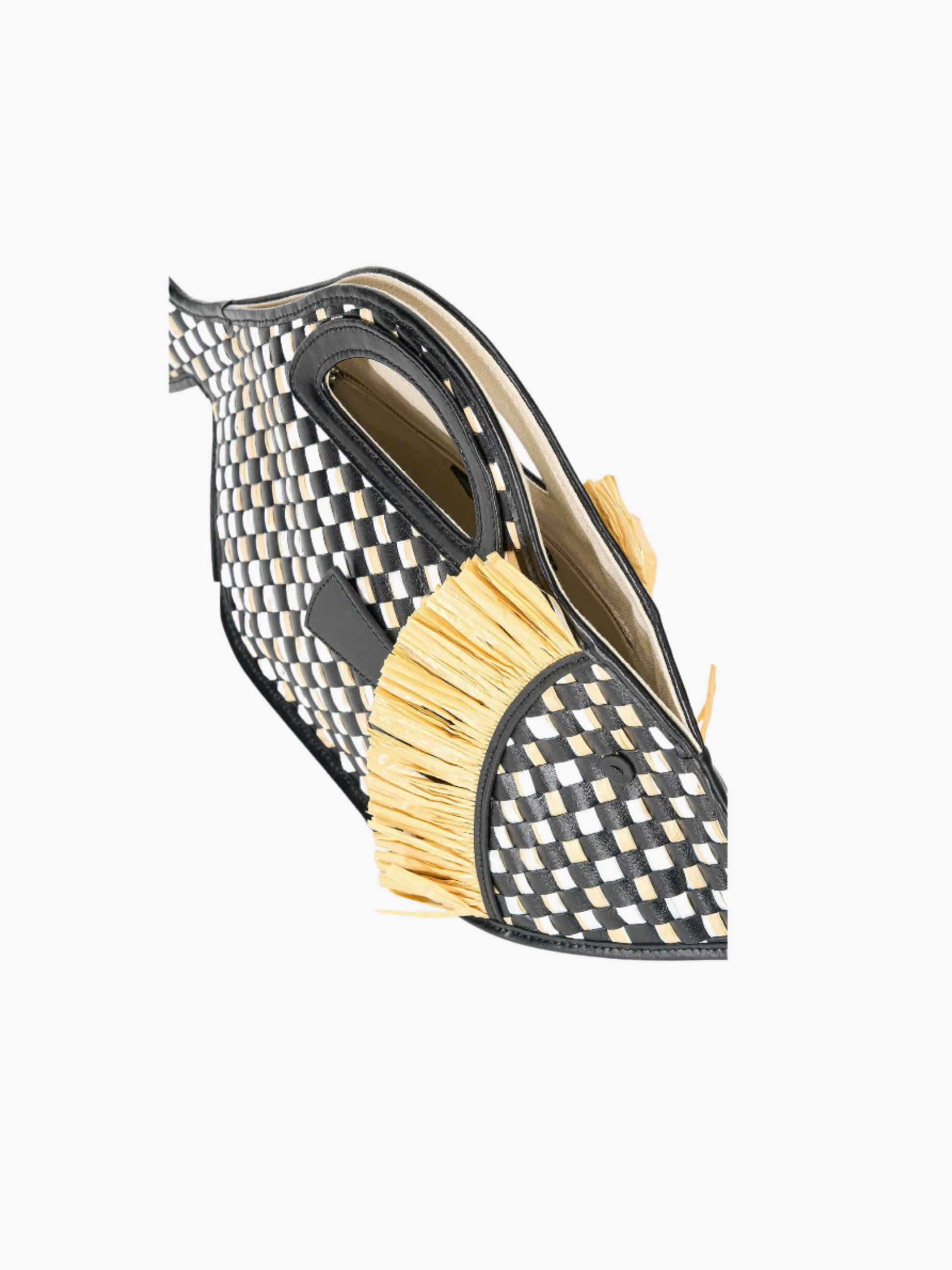 - Fish-shaped silhouette with handwoven raffia and leather